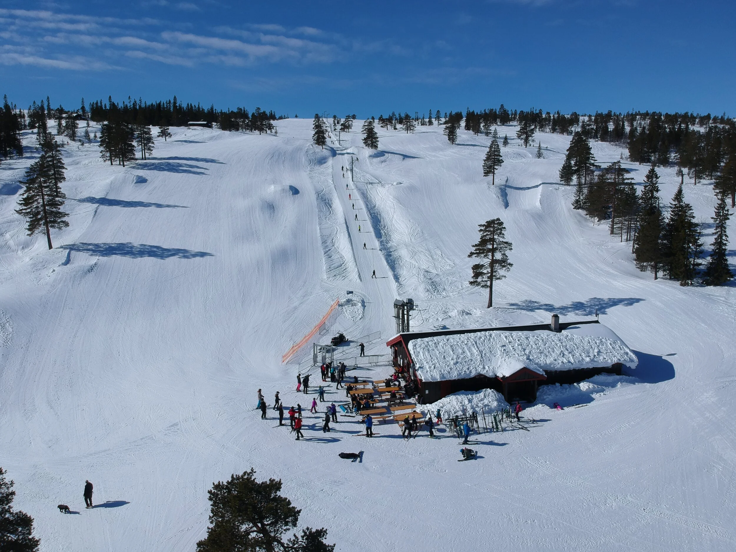 Varmestua ligger fint til i bunn av alpinbakken. Det er godt med sitteplasser, men på en dag med fint vær er det også mulig å sitte ute.